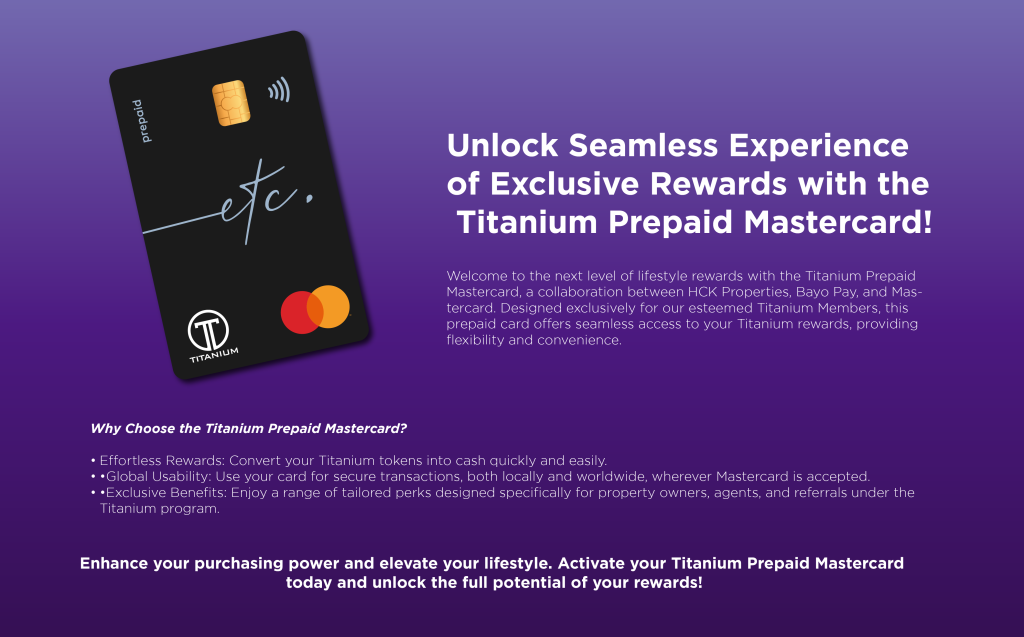 Welcome to the next level of lifestyle rewards with the Titanium Prepaid Mastercard, a collaboration between HCK Properties, Bayo Pay, and Mastercard. Designed exclusively for our esteemed Titanium Members, this prepaid card offers seamless access to your Titanium rewards, providing flexibility and convenience.